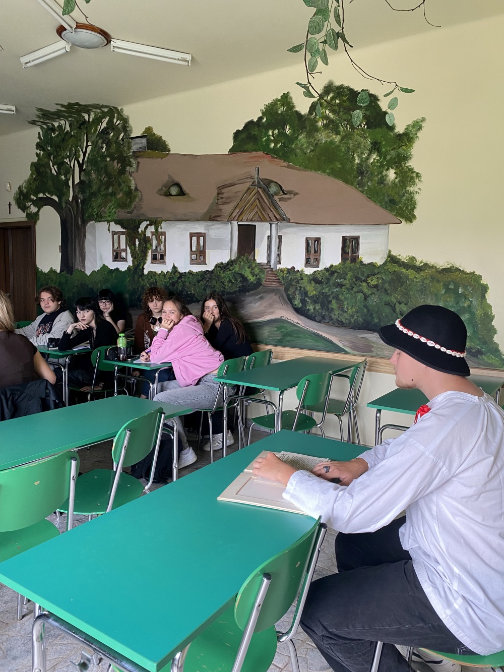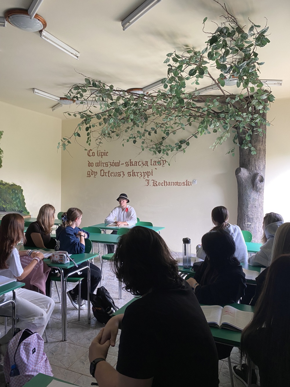 Ogromne podziękowania dla Dawida, który wcielił się w ks. prof. Józefa Tischnera i pięknie odczytał Pieśń 9 Ksiąg wtórych. Dziękujemy także Pani Kamili Wrożynie za błyskawiczny i treściwy „pakiet wiedzy” o twórczości Kochanowskiego oraz uczennicy, która z odwagą zmierzyła się z wymagającą, XVI-wieczną polszczyzną. Wydarzenie oczywiście przygotowała szkolna biblioteka pod czujnym okiem Pani Ewy Olejniczak!